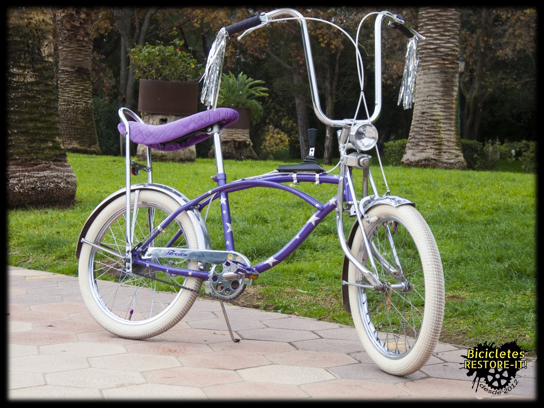 tapizado de sillín en terciopelo, streamers cromados, palanca de 3 marchas y freno de tambor en el buje trasero.